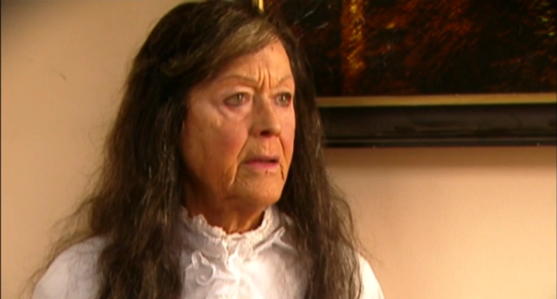 Sarah heeft zwartgrijs haar en amberbruine ogen.